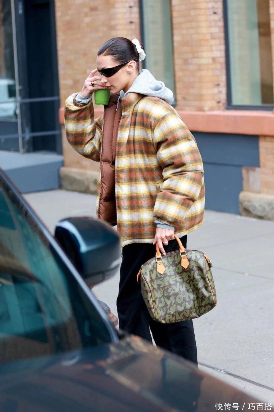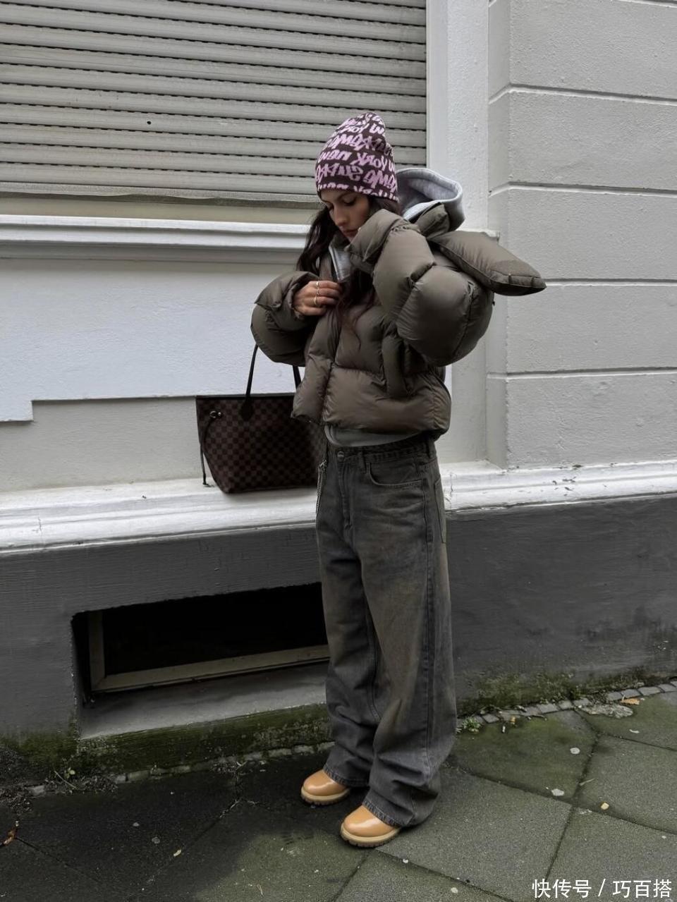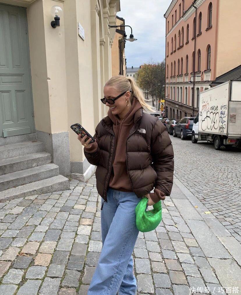 第三,棕色、咖啡色、卡其色、驼色类羽绒服,也可以和灰色羽绒服搭配,从博主上身效果来看,单品外穿出门是没有任何违和感的。