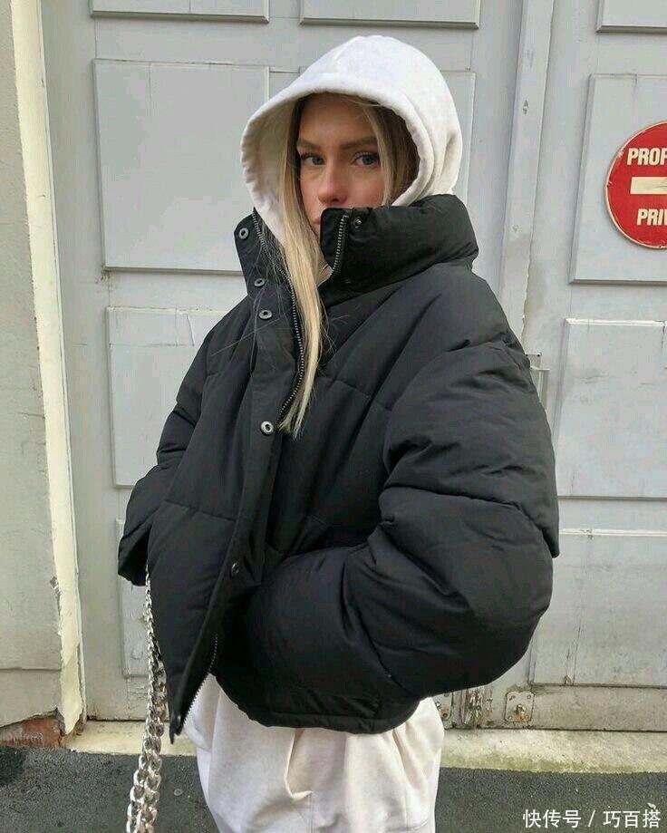 但有一点需要提醒大家一下,虽然现在很少有姐妹会在选择短款羽绒服的情况下搭配宽而肥大的廓形连帽卫衣,但为了以防万一,还是要需要强调一下的,这种组合模式轻易不要选,在万不得已的情况下,也尽量不要选。
